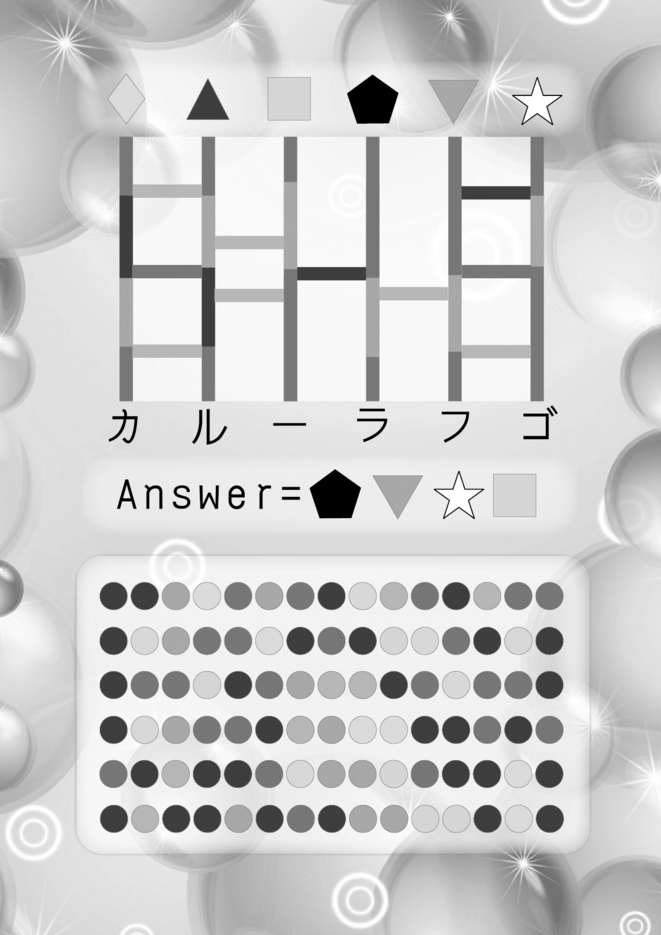 ~STEP1~『目覚め』目が覚めるとそこは殺風景な通路だった。ここはどこだろう?通路を進んでいるとあることに気づく。色がない。こんなにもいろんなものが置いてあるのにも関わらず、色がないのだ。さらに進んでいくと突き当りに差し掛かる。突き当りには一枚の大きな扉があった。その扉には一枚の紙が貼られていた。なんだろうこれは?上半分は見たことあるような形だが、下はなんだろう?色がないからか、全くなんだかわからない。何かの暗号?まずはわかりそうな上半分から解いてみようか。